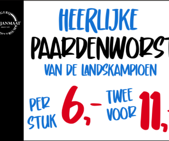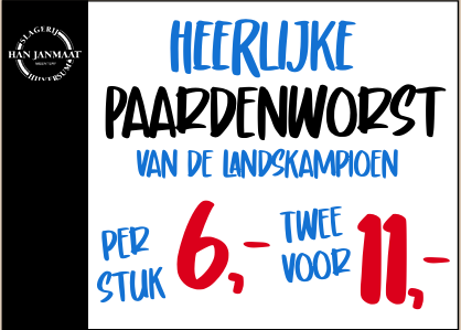 Terug naar overzicht Sinds laatste markt 48x bekeken Geldig op 26 Mar de Lekkerste Paardenworst van Nederland! Omschrijving Deel op Facebook Verstuur per mail Terug naar overzicht 48 x bekeken