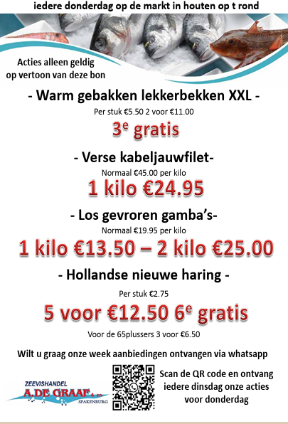 Terug naar overzicht Sinds laatste markt 52x bekeken Aanbiedingen van de week Geldig op 26 Mar Vishandel A de Graaf en zoon Omschrijving Deel op Facebook Verstuur per mail Terug naar overzicht 52 x bekeken